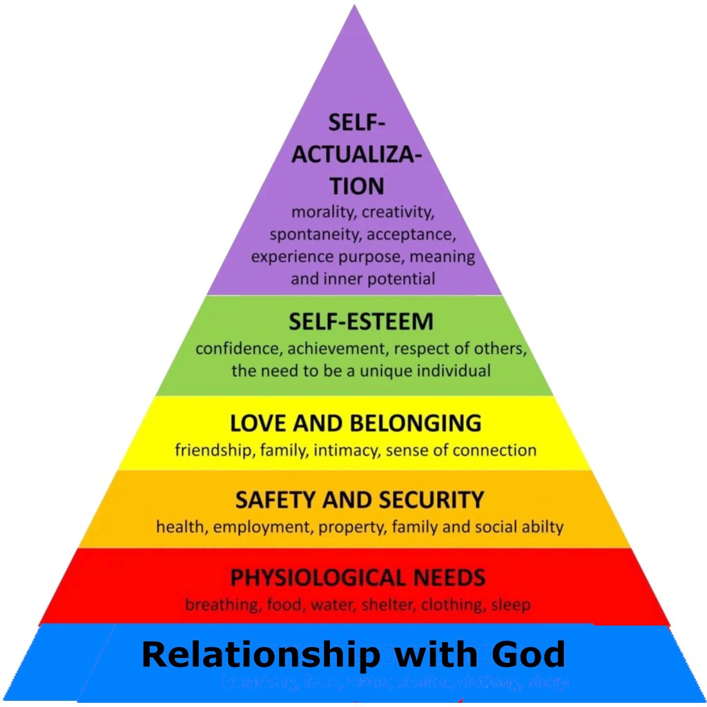 Abraham Maslow is a humanistic psychologist who is most famous for his “Hierarchy of Needs,” which is frequently pictured as a pyramid in which the base physiological needs (food, water, air, shelter, clothing, sleep, etc.) must be met before a human can consider meeting any other needs (Safety, then Love/Belonging, then Esteem, and finally Self-actualization). According to Maslow, it isn’t easy to consider any relationships or intellectual/occupational achievement until you satisfy your basic physiological needs.3 For example, it is hard to think about doing better at your job if you are homeless or hungry. That makes a lot of sense and is something we see frequently in our homeless ministry. But followers of Jesus need to add a new level to Maslow’s pyramid to make it consistent with the Bible.