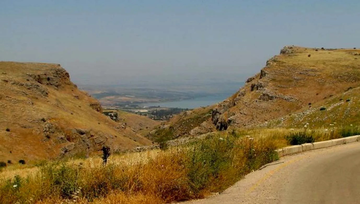 Arbel is a volcanic peak that was split in half by an earthquake. Here is a view from the west of Arbel, between the halves, with the Sea of Galilee in the background.