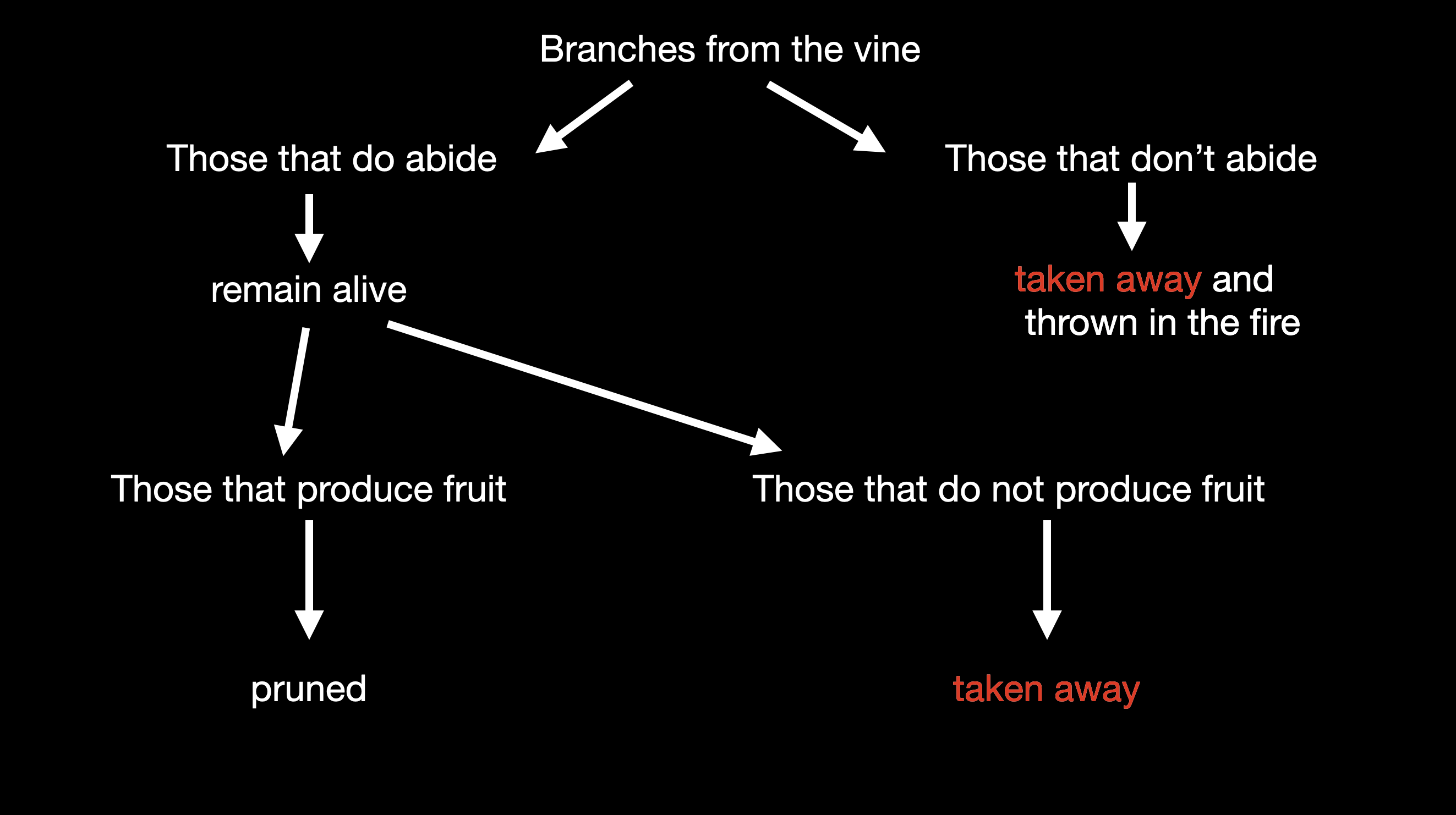 The branches represent people divided into two groups: those who abide in Jesus and those who do not.  To ‘abide’ means ‘to live in.’  If you abide in Jesus, He is your source of life; you get your life from him, so you stay connected to him.  You get 100% of your nourishment from him. If you tear off a branch from a plant, will it produce fruit?  If taken off the plant, the branch can never bear fruit; it will wither and die.  Remember, the branches are people who either remain in Jesus and live or who are cut off from Jesus and die.
