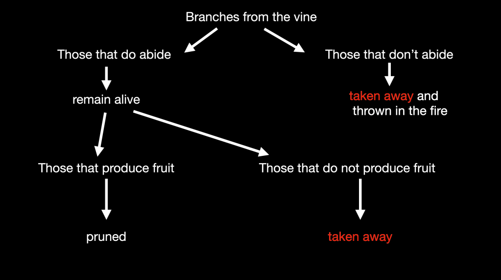 John 15:1 “I am the true vine, and my Father is the vinedresser.  Every branch in me that does not bear fruit he takes away, and every branch that does bear fruit he prunes that it may bear more fruit.  Already you are clean because of the word that I have spoken to you.   Abide in me, and I in you. As the branch cannot bear fruit by itself unless it abides in the vine, neither can you unless you abide in me.   I am the vine; you are the branches. Whoever abides in me and I in him, he it is that bears much fruit, for apart from me, you can do nothing.   If anyone does not abide in me, he is thrown away like a branch and withers, and the branches are gathered, thrown into the fire, and burned.   If you abide in me, and my words abide in you, ask whatever you wish, and it will be done for you.  By this, my Father is glorified, that you bear much fruit and so prove to be my disciples.  As the Father has loved me, so have I loved you. Abide in my love.   If you keep my commandments, you will abide in my love, just as I have kept my Father’s commandments and abide in his love.   These things I have spoken to you, that my joy may be in you, and that your joy may be full.”