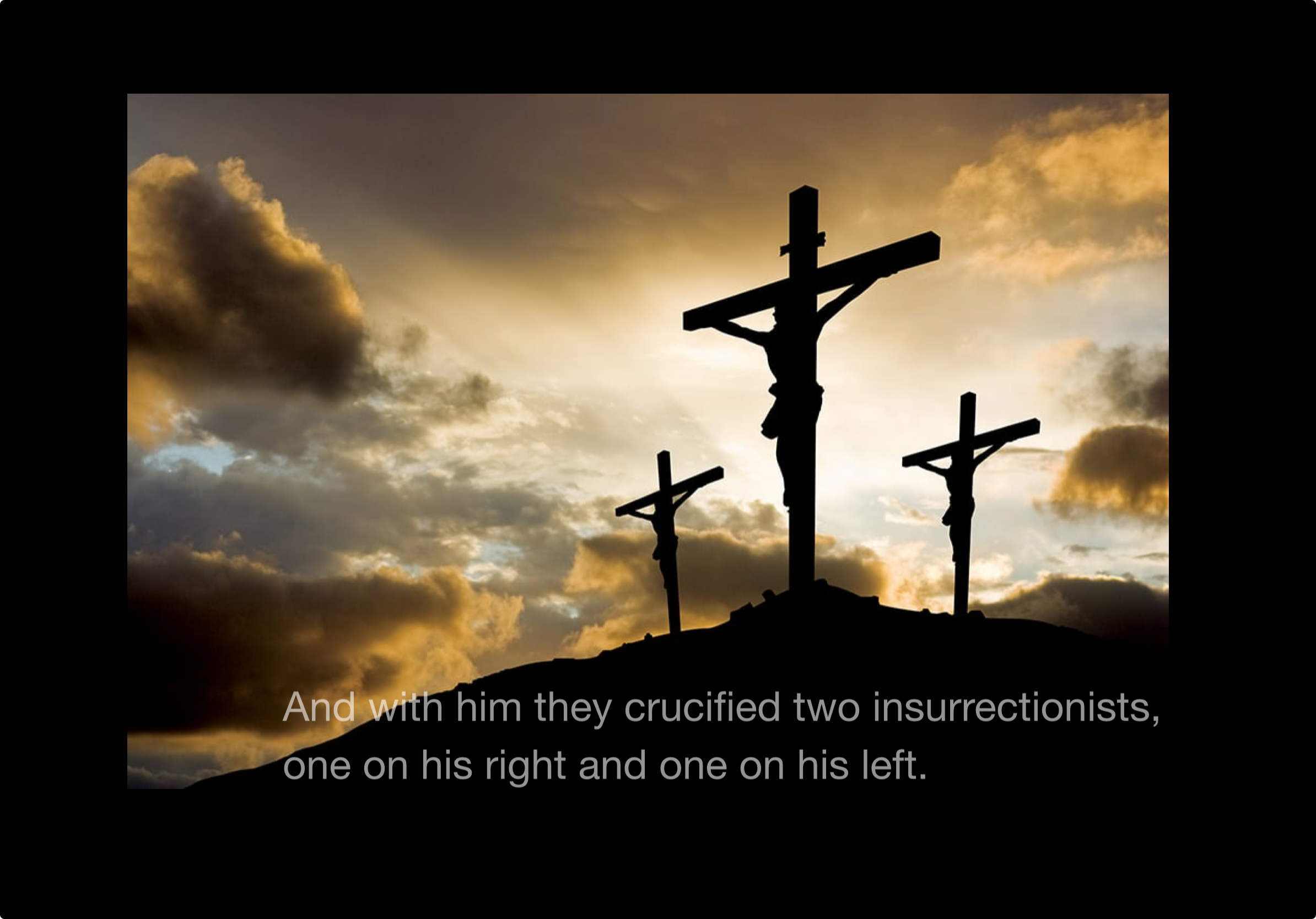 “And with him, they crucified two insurrectionists, one on his right and one on his left.”