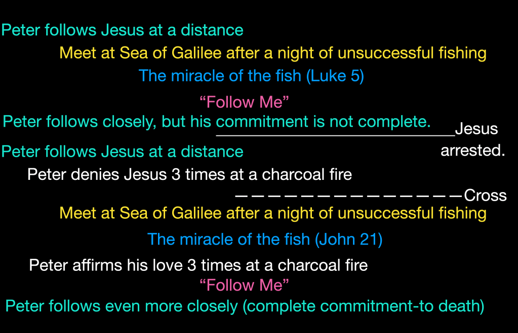 When Jesus is on trial, John tells us that Peter follows Jesus from a distance. Then, in the courtyard of the High Priest, Peter denies Jesus three times by the charcoal fire.  Jesus is crucified  and 3 days later resurrected.   They meet again on the Sea of Galilee (Just as before) after a night of unsuccessful fishing.  Jesus tells them to drop their nets again, and they catch a vast number of fish.  Then Jesus gives Peter a chance to affirm his love three times, at one of all places, a charcoal fire.  Then Jesus says (as he did back in July) Follow me.  Peter now follows Jesus closely with complete commitment. Jesus tells him, “You will stretch out your hands and go where you do not want to go. You will pass the test the next time; you will be crucified.