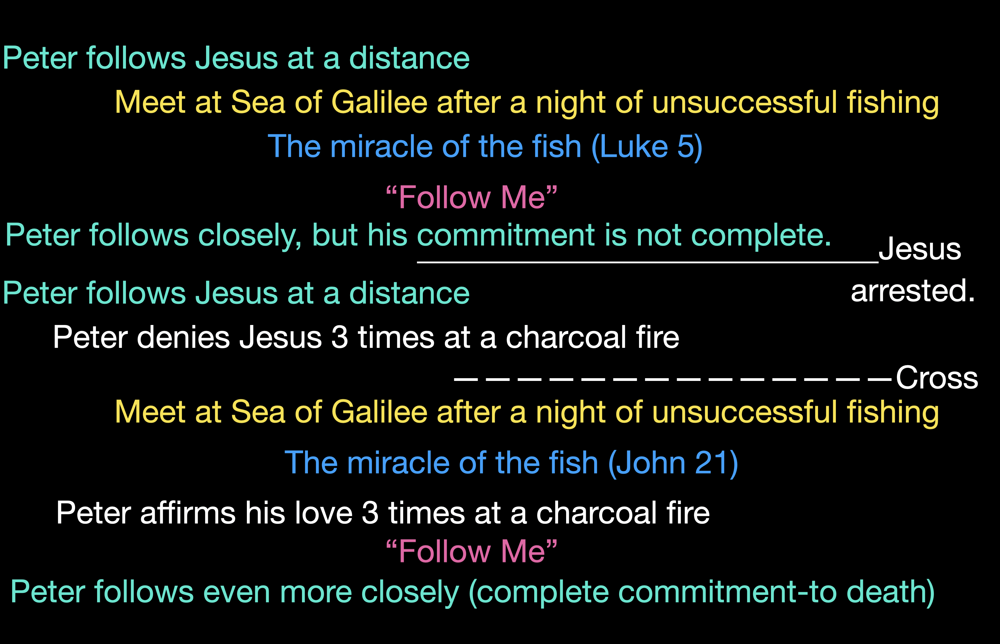 When Jesus is on trial, John tells us that Peter follows Jesus from a distance. Then, in the courtyard of the High Priest, Peter denies Jesus three times by the charcoal fire.  Jesus is crucified  and 3 days later resurrected.   They meet again on the Sea of Galilee (Just as before) after a night of unsuccessful fishing.  Jesus tells them to drop their nets again, and they catch a vast number of fish.  Then Jesus gives Peter a chance to affirm his love three times, at one of all places, a charcoal fire.  Then Jesus says (as he did back in July) Follow me.  Peter now follows Jesus closely with complete commitment. Jesus tells him, “You will stretch out your hands and go where you do not want to go. You will pass the test the next time; you will be crucified.