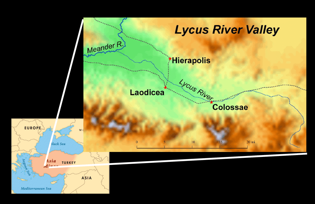 Laodicea is situated in the fertile Lycus River valley, in our modern-day Turkey. Six miles to the north lies the city of Hieropolis, renowned for its medicinal hot springs, which feature a spa dating back to around 200 BC. Eight miles to the east lies Colossae, famous for its refreshing, pure, and cold natural spring water. In contrast, Laodicea had no water source in the city. An aqueduct, cut from stone, transported water from Denizli, 5 miles south.