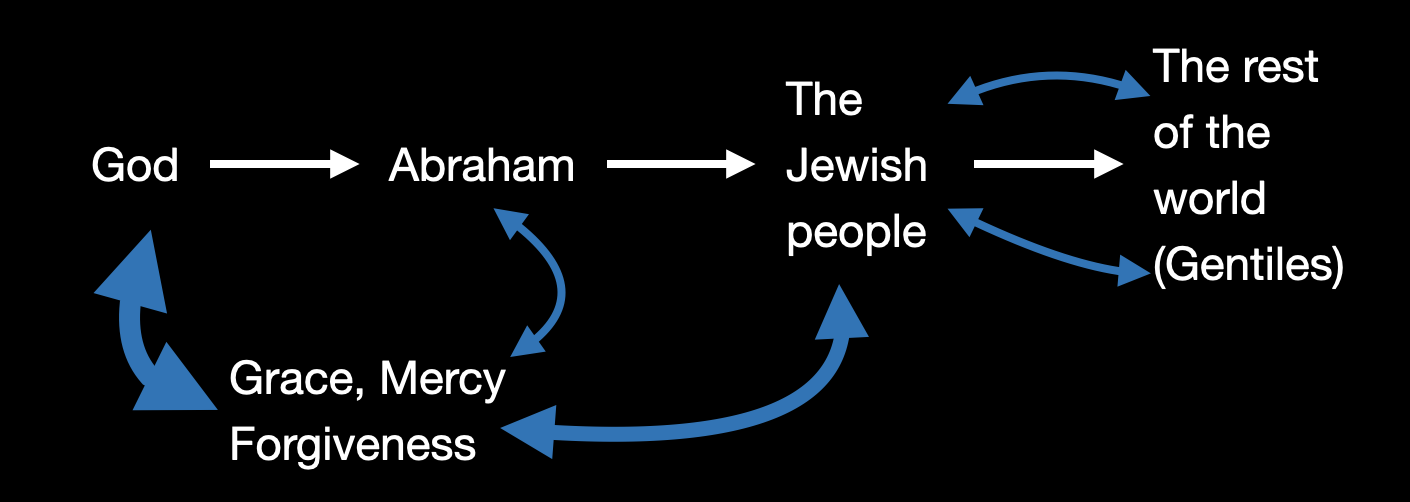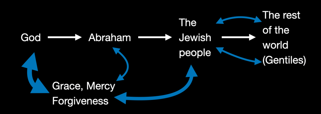 God reaches out to Abraham and establishes a covenant with him out of his grace, mercy, and forgiveness. Then Abraham’s descendants, the Jewish people, are able to join in this Abrahamic covenant with God. (All this is just as before.) But then the Jewish people are to reach out to the rest of the world – the Gentiles. The Gentiles can join in a covenant with God of mercy, grace, and forgiveness just as the Jews can. They don’t have to become Jewish to be in covenant with God. But now God’s Grace, Mercy, and Forgiveness have a name. And that name is Jesus.