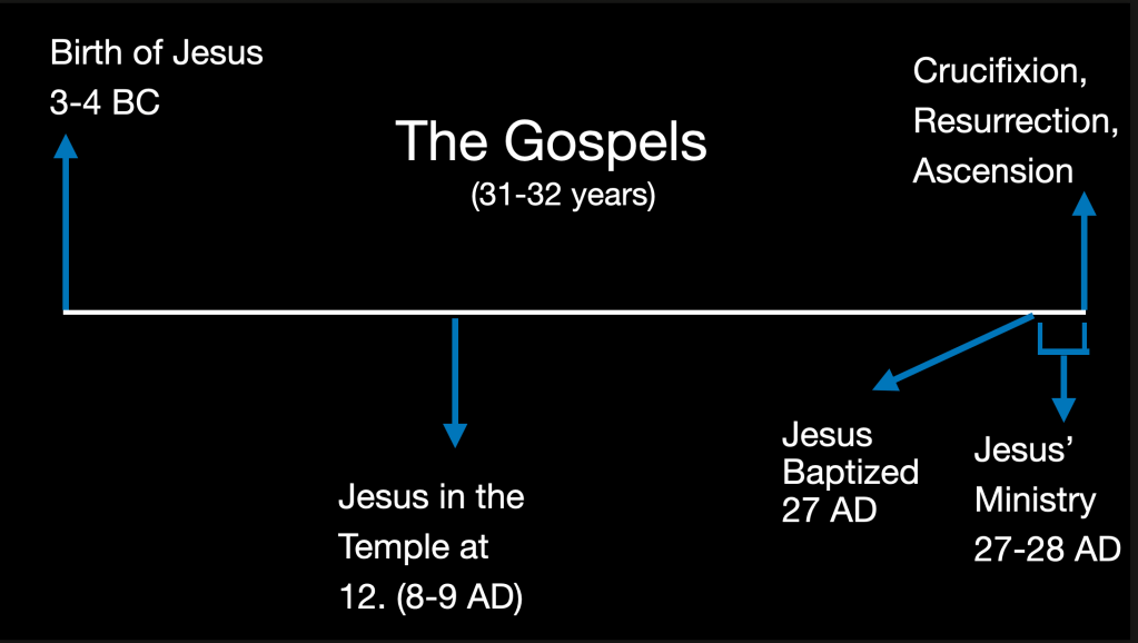 Before we continue in Acts, I want to talk about the timeline. (You will not find universal agreement on the actual dates, but it is the division of time I want you to see here.) The Gospels begin with the story of John the Baptist’s and Jesus’ birth around 4 BC and end with his crucifixion, resurrection, and ascension in 28 AD, covering 31-32 years. But other than the birth narrative and the visit to the temple at 12 years old, everything else in the Gospels happens in this 1 1/2 year or 70-week period. When we covered the ministry of Jesus, we went pretty much week by week, following him through the Gospels in real time.