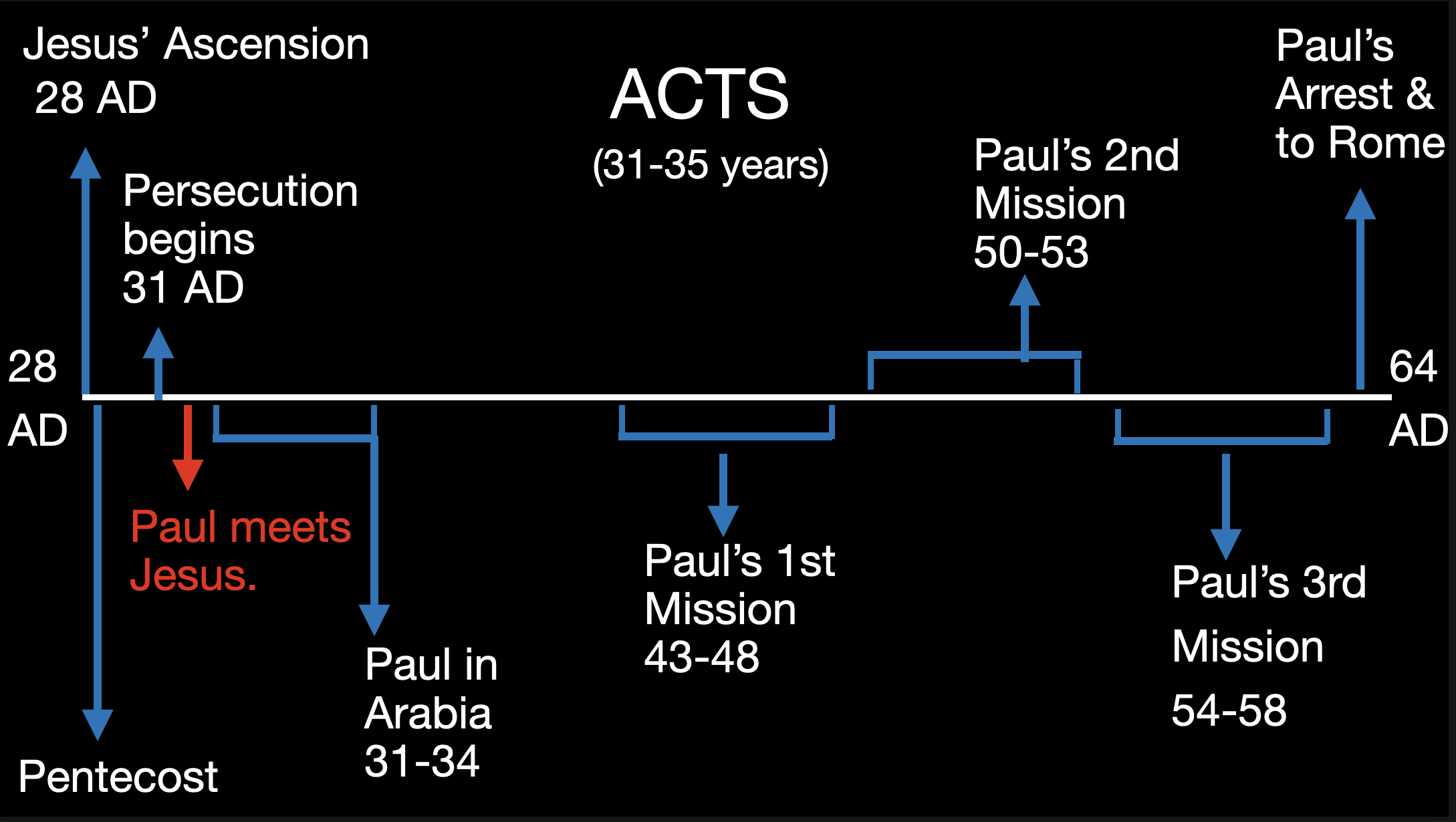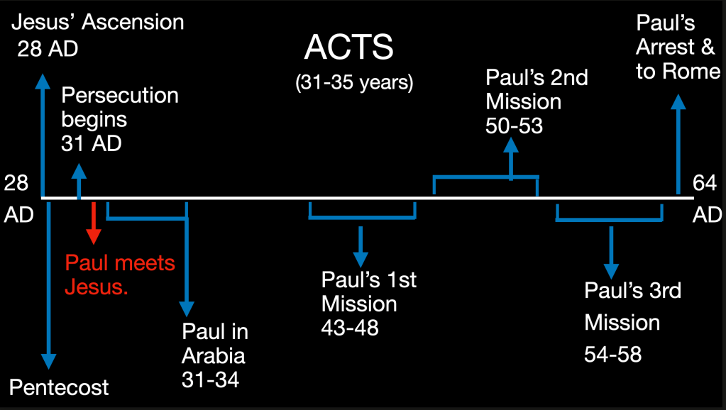 The Timeline for Acts is also around 30-35 years, but the action is not concentrated at a single point. Acts begins with the Ascension of Jesus and Pentecost, which would have been in June of 28 AD. So we have covered the first 8.5 chapters of Acts in the past 6 months, but that encompasses 2-3 years. By the 9th chapter of Acts, it is now 2-3 years since Jesus’s crucifixion, resurrection, and the events of Pentecost. The church has grown in numbers, and persecution has begun. The rest of Acts covers the 3 years Paul spent in Arabia and his three missionary journeys.