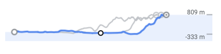 This shows the altitude changes on this path. Note that the final portion of the journey ascends from 333 meters below sea level (-1092 feet) to 809 meters above sea level (+2654 feet), which is a change of 1142 meters or 3746 feet.