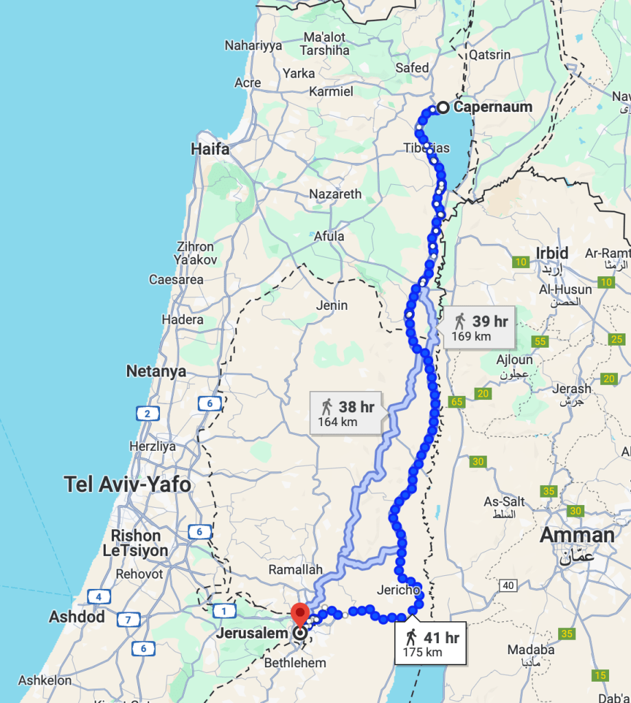 Google Maps says that it is a 41-hour walk from Capernaum to Jerusalem. Good luck with that today. The roads may be better, but the number of checkpoints makes that unlikely. Google has you hugging the Sea of Galilee to the west, then continuing on the western side of the Jordan through Jericho, then turning west to Jerusalem.